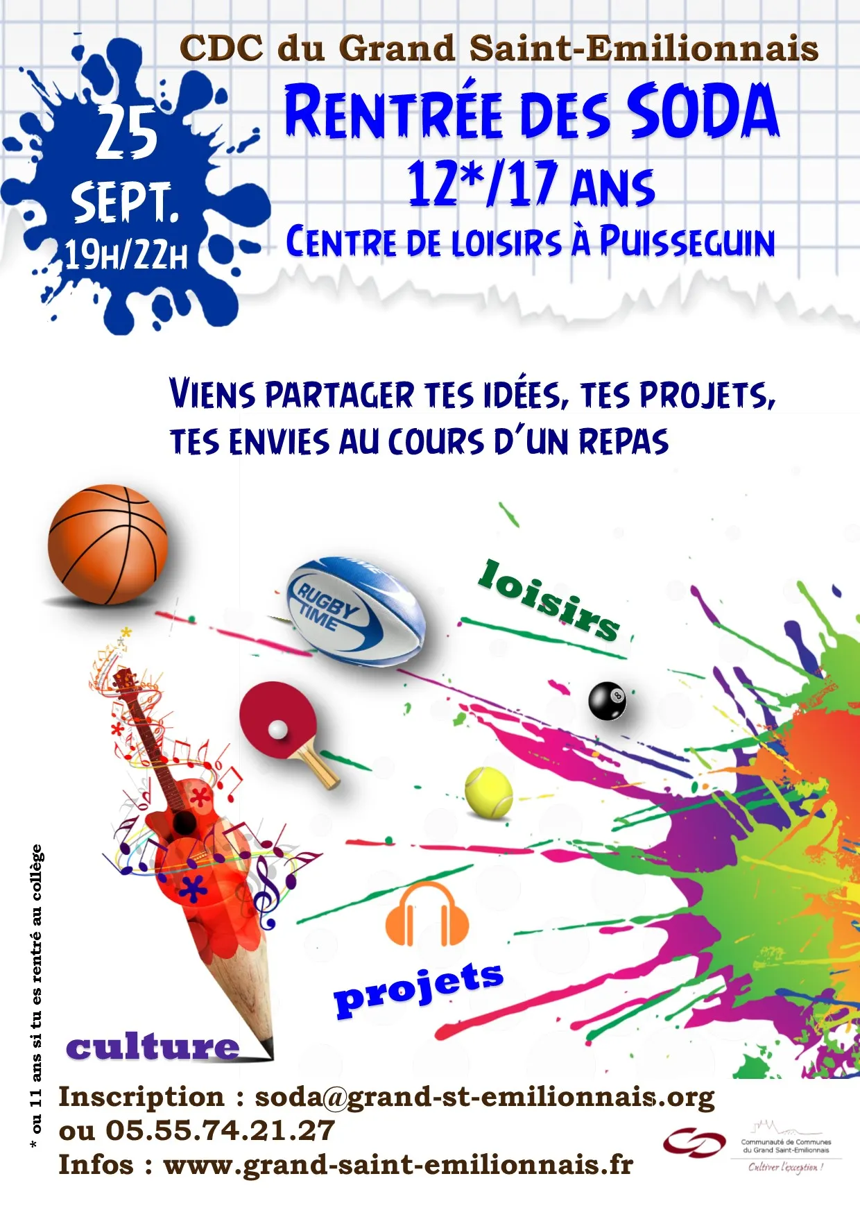 SODA pour nos ados 17 Sep 2015 | CDC du Grand Saint-Emilionnais Ne laissez pas vos ados (soda) seuls, devant leur écran… Rentrée des Ados (12-17 ans) du village, coachés par notre Communauté de communes : vendredi 25 septembre, 19h00 / 22h00 autour d’un repas !