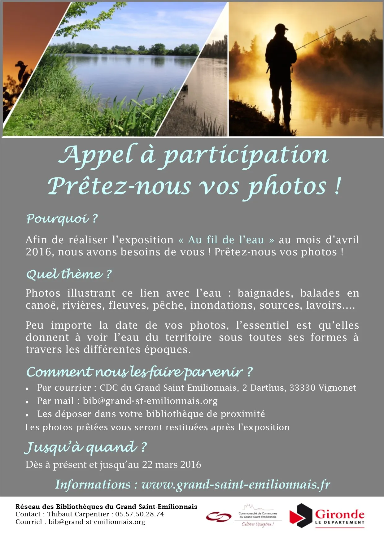 Afin de réaliser l’exposition « Au fil de l’eau » au mois d’avril 2016, nous avons besoins de vous ! Prêtez-nous vos photos !