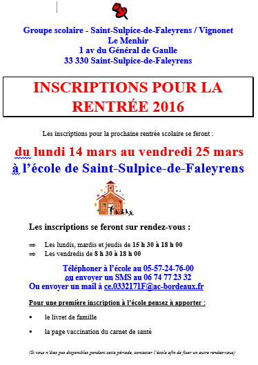 Les inscriptions pour la prochaine rentrée scolaire se feront : du lundi 14 mars au vendredi 25 mars à l’école de Saint-Sulpice-de-Faleyrens