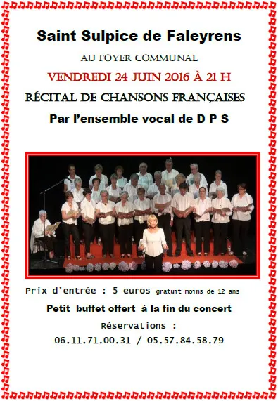 Vendredi 24 juin 2016, à 21h00,  au foyer communal, l’ensemble vocal de DPS vous propose un récital de chansons françaises. Entrée 5 €