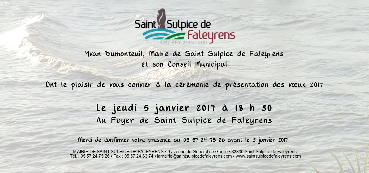 Cérémonie des voeux du Maire 27 Déc 2016 | Informations municipales Yvan Dumonteuil, Maire de Saint Sulpice de Faleyrens et son Conseil Municipal Ont le plaisir de vous convier à la cérémonie de présentation des vœux 2017 Le jeudi 5 janvier 2017 à 18 h 30 Au Foyer de Saint Sulpice de Faleyrens