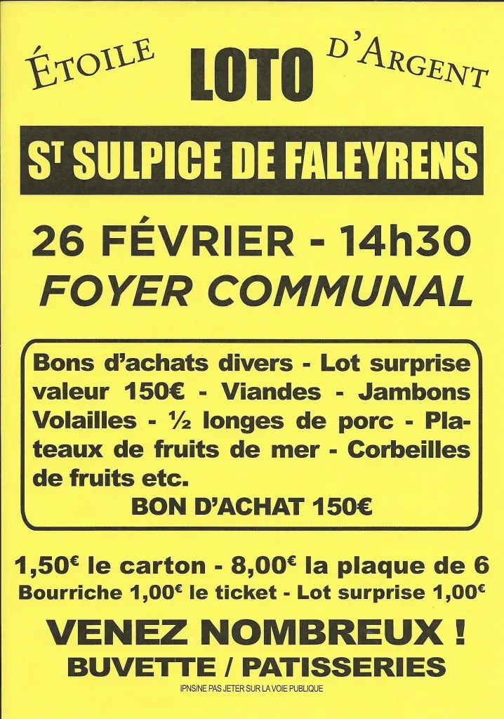 Loto de l’Etoile d’Argent 8 Fév 2017 | Lotos l’Etoile d’argent vous propose son loto le 26 février à 14h30 au foyer communal de Saint Sulpice de Faleyrens.