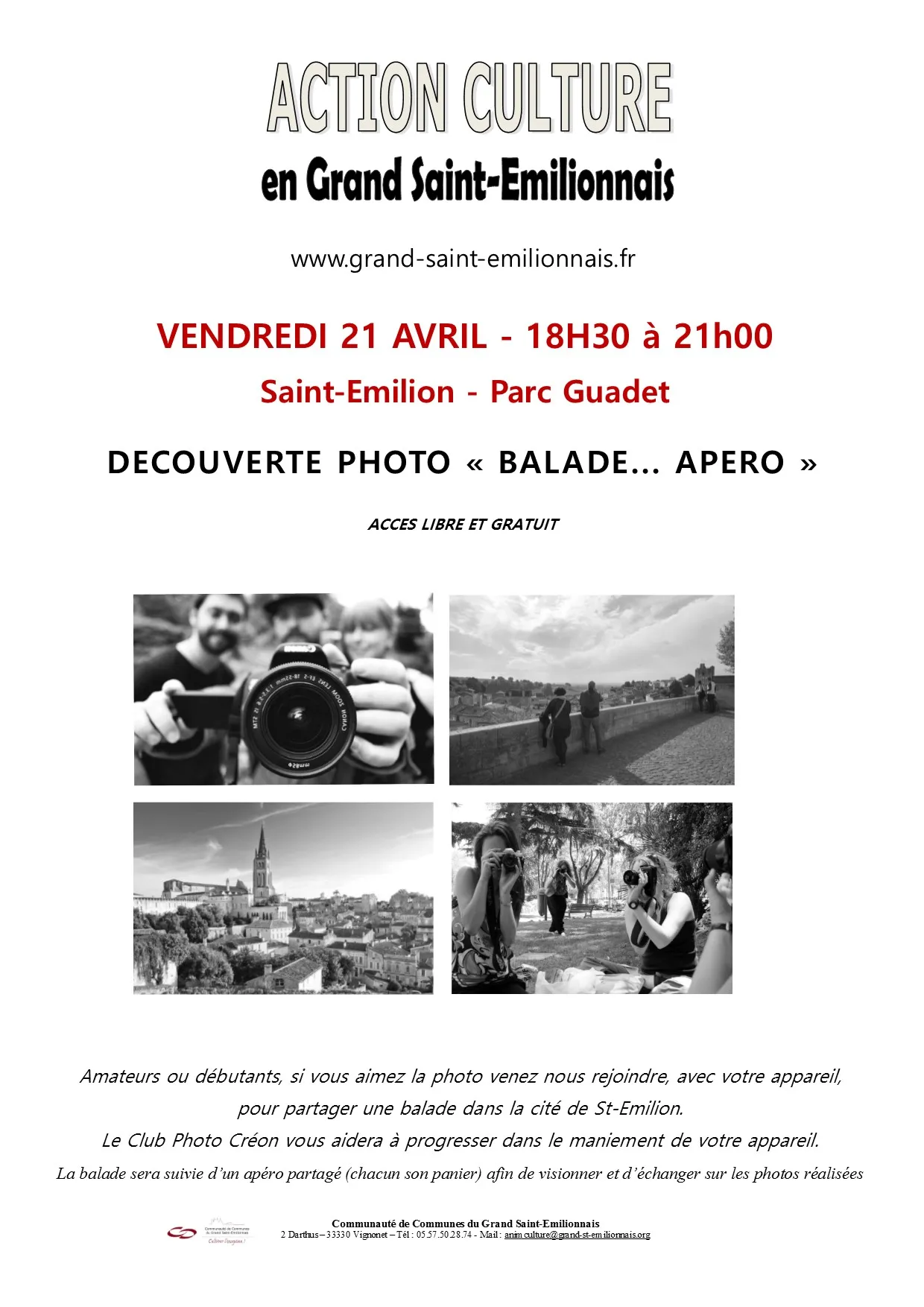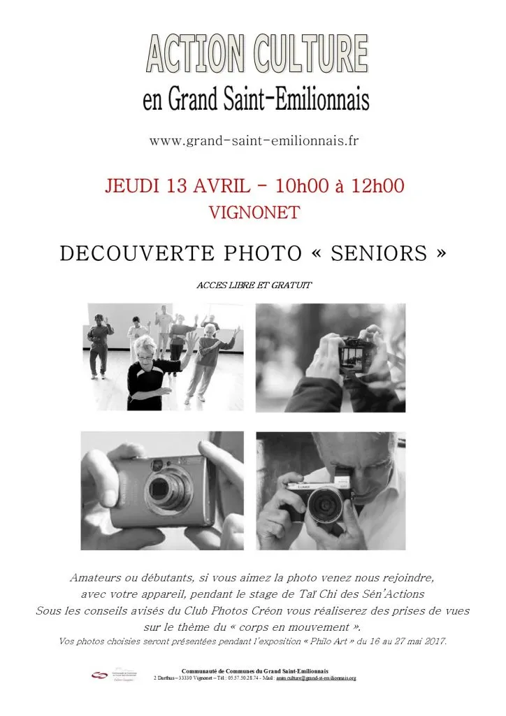 Découverte photo pour tous… balade … apéro 1 Avr 2017 | CDC du Grand Saint-Emilionnais Dans le cadre des actions culture de notre communauté de communes, voici deux journées autour de la photo proposés aux adultes. Ces ateliers sont ouverts à tous les habitants du territoire et sont gratuits.