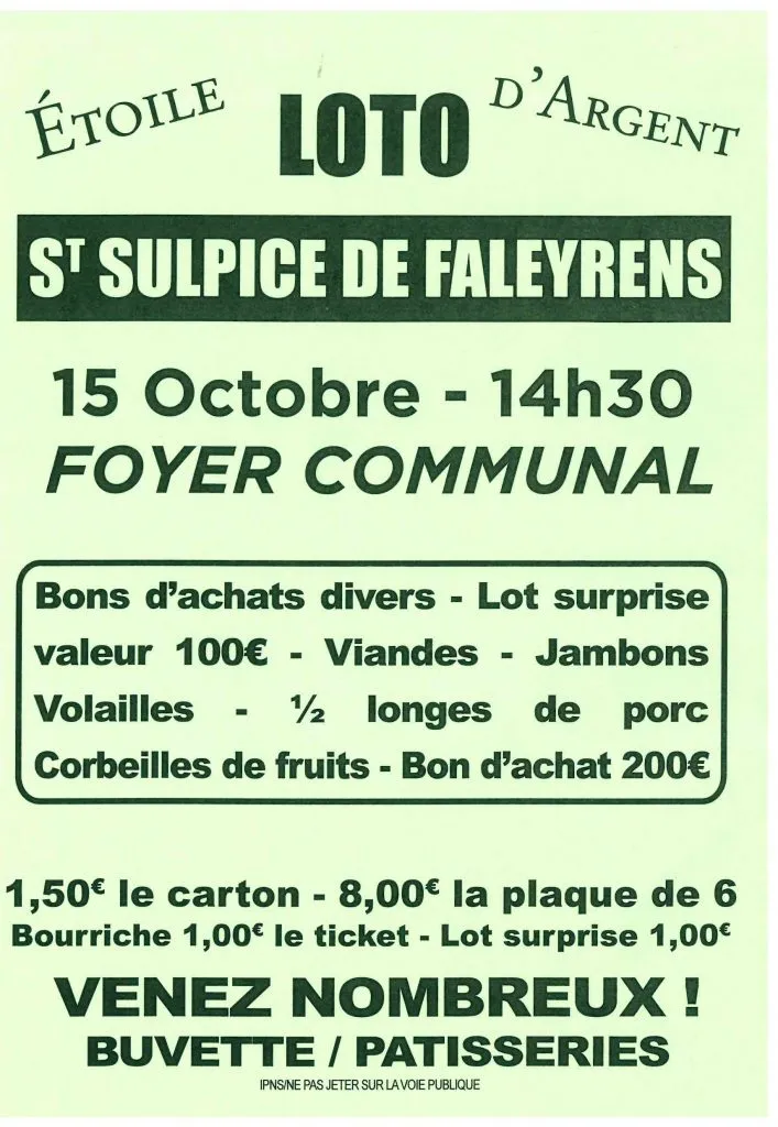 Dimanche 15 octobre  à 14h30 au foyer communal de Saint Sulpice de Faleyrens, Loto de l’Etoile d’Argent.