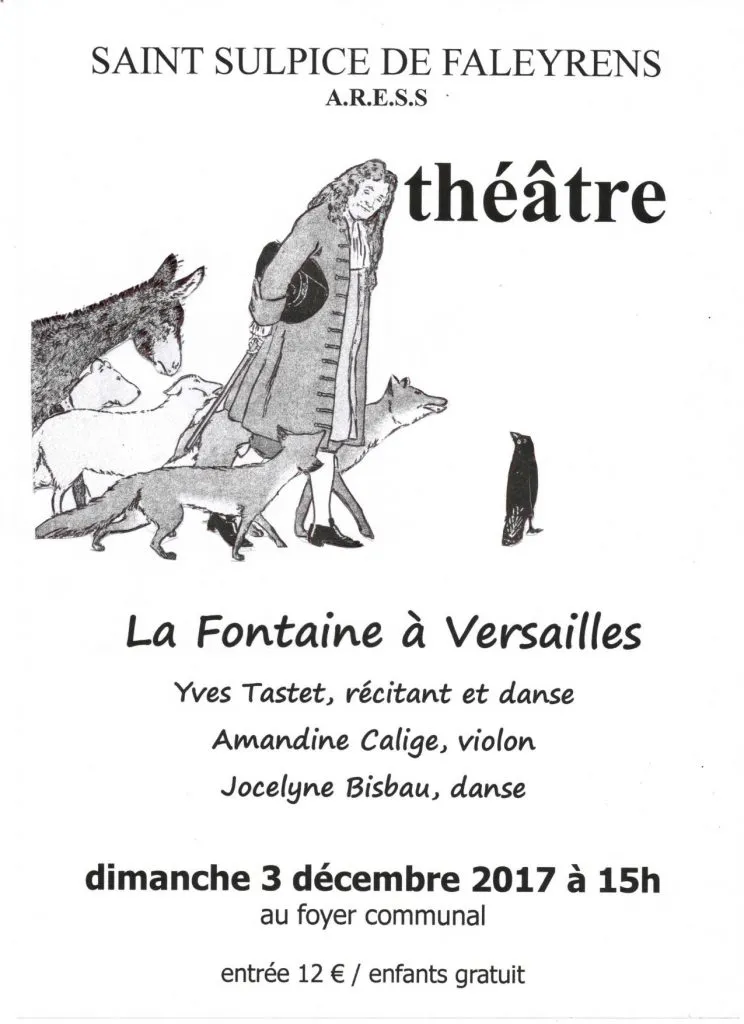 « La Fontaine à Versailles » Théatre 23 Nov 2017 | Animations dans la commune, Associations La Fontaine à Versailles, dimanche 3 décembre 2017 à 15h00 au foyer communal de Saint Sulpice de Faleyrens. Un événement organisé par l’ARESS, Association de Restauration de l’Eglise de Saint Sulpice de Faleyrens.