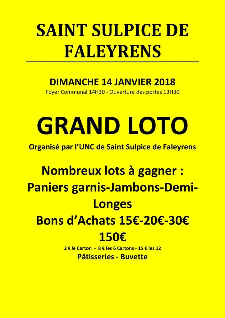 Loto de l’UNC 4 Jan 2018 | Lotos Grand Loto organisé par l’UNC à Saint Sulpice de Faleyrens le dimanche 14 janvier à 14h30 au foyer communal. Nombreux lots à gagner
