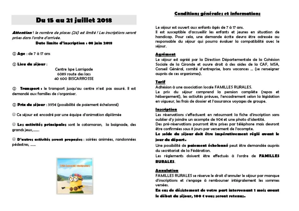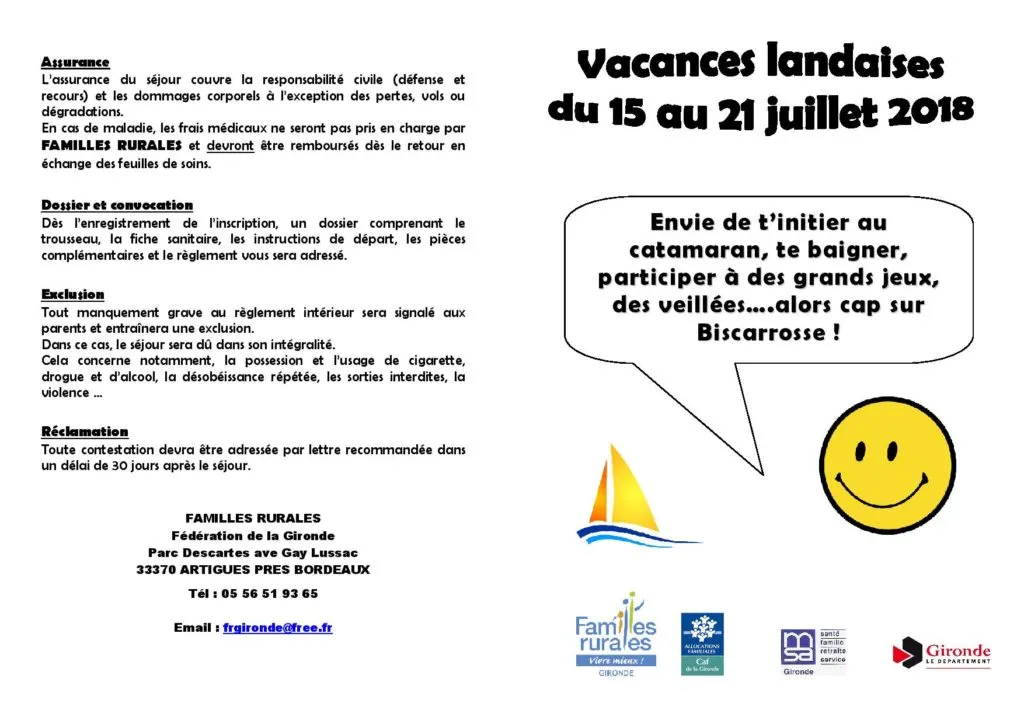 Il reste des places pour la colonie Familles Rurales à Biscarosse du 15 au 21 juillet 2018.