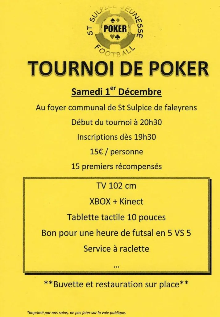 Samedi 1er décembre, Nombreux lots à gagner à l’occasion du Tournoi de Poker au Foyer communal de Saint Sulpice de Faleyrens organisé par Saint Sulpice Jeunesse Football : TV 102 cm, XBOX, Tablette tactile, etc…