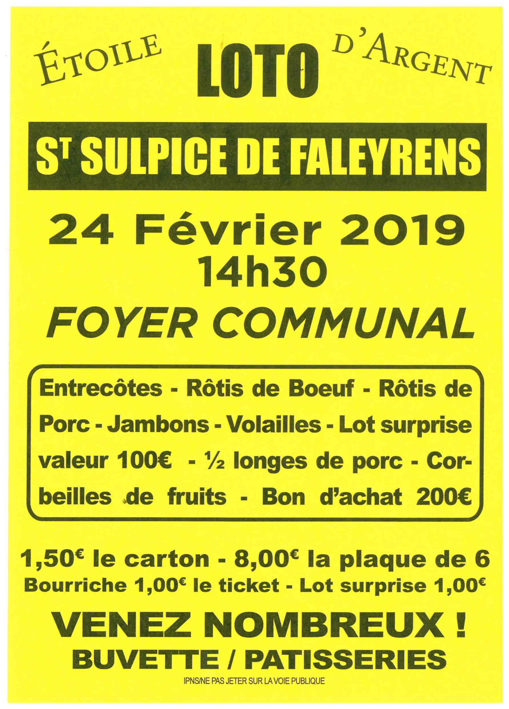LOTO de l’Etoile d’Argent 20 Fév 2019 | Lotos LOTO ETOILE D’ARGENT à Saint Sulpice de Faleyrens Dimanche 24 février à 14h30 au Foyer Communal.