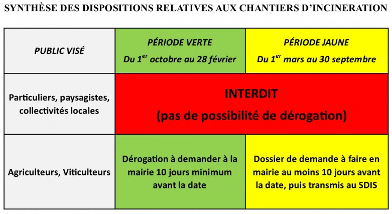 – En période verte (du 01/10 au 28/02) : par le Maire des communes, pour les végétaux émanant de leurs travaux. La demande écrite d’autorisation doit être déposée à la mairie au moins 10 jours avant la mise à feu.