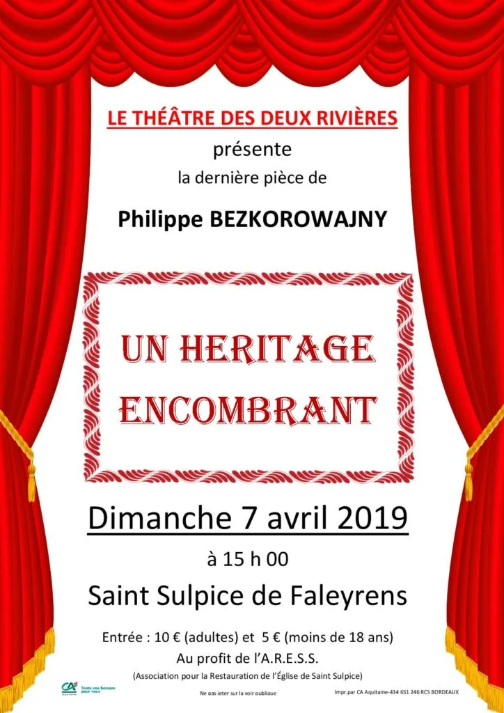 l’ARESS vous invite à découvrir une pièce de théâtre qui vous est proposée par le Théâtre des deux rivières : UN HERITAGE ENCOMBRANT le dimanche 7 avril à 15h00 au Foyer Communal de Saint Sulpice de Faleyrens.