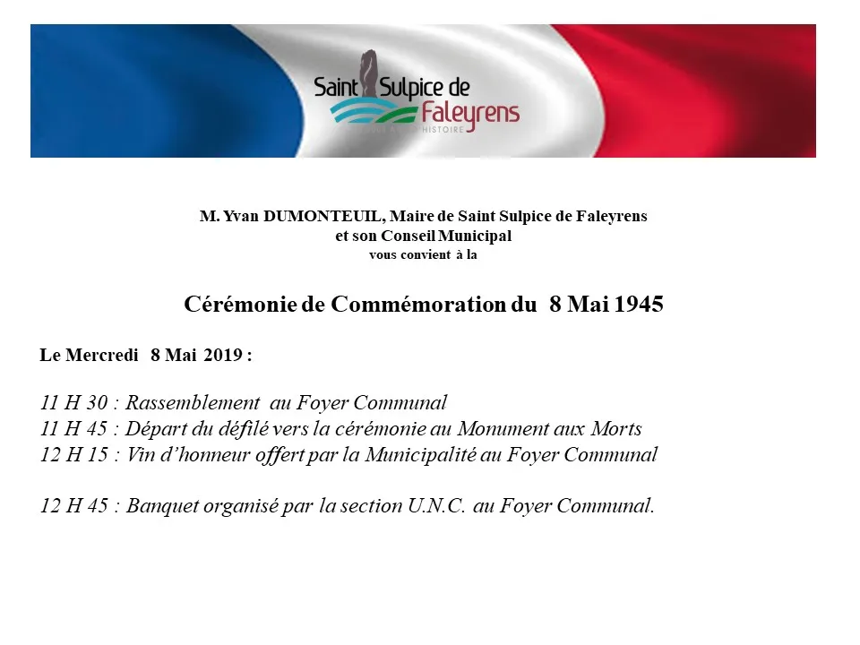 Vous êtes cordialement invité (e) à participer à la cérémonie de l’Armistice de 1945 dont vous trouverez ci-dessous le programme: