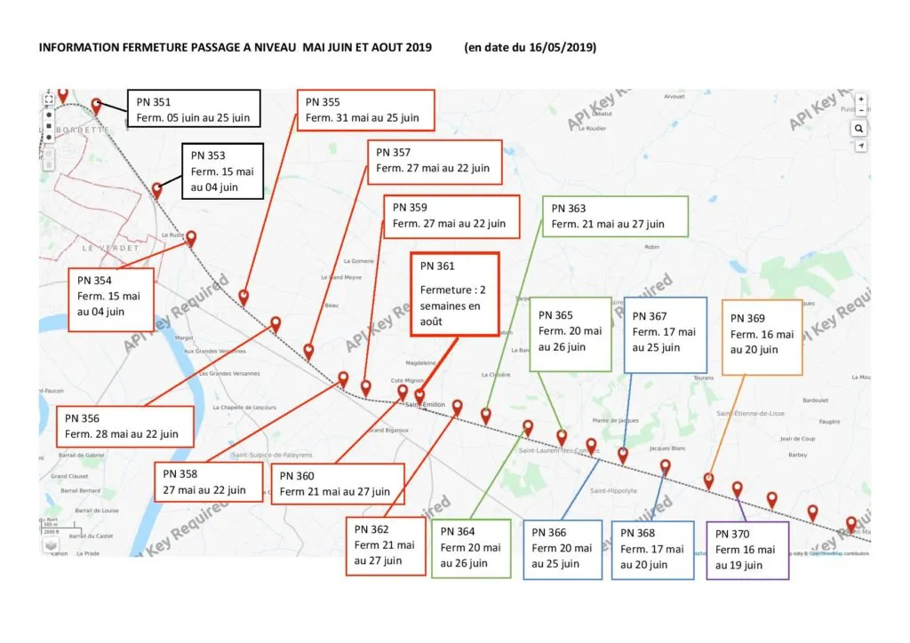 Les informations relatives aux dates de fermeture et de ré-ouverture des passages à niveaux évoluent quasi-quotidiennement. Cependant, afin de vous aider à circuler, voici une carte des travaux.