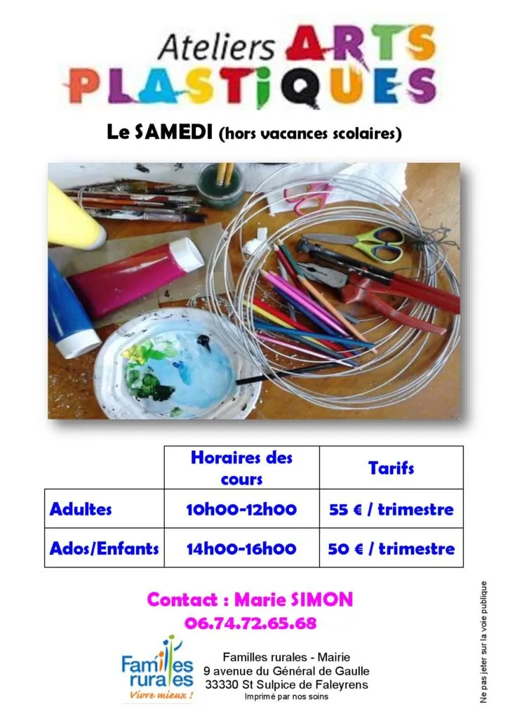 Tous les samedis à Saint Sulpice de Faleyrens, passez deux heures en compagnie de Marie Simon et son atelier de dessin. Débutants ou confirmés vous pourrez toujours trouver votre bonheur au milieu des argiles, des pâtes à modeler, des peintures, des dessins et multiples affaires de bricolage.
