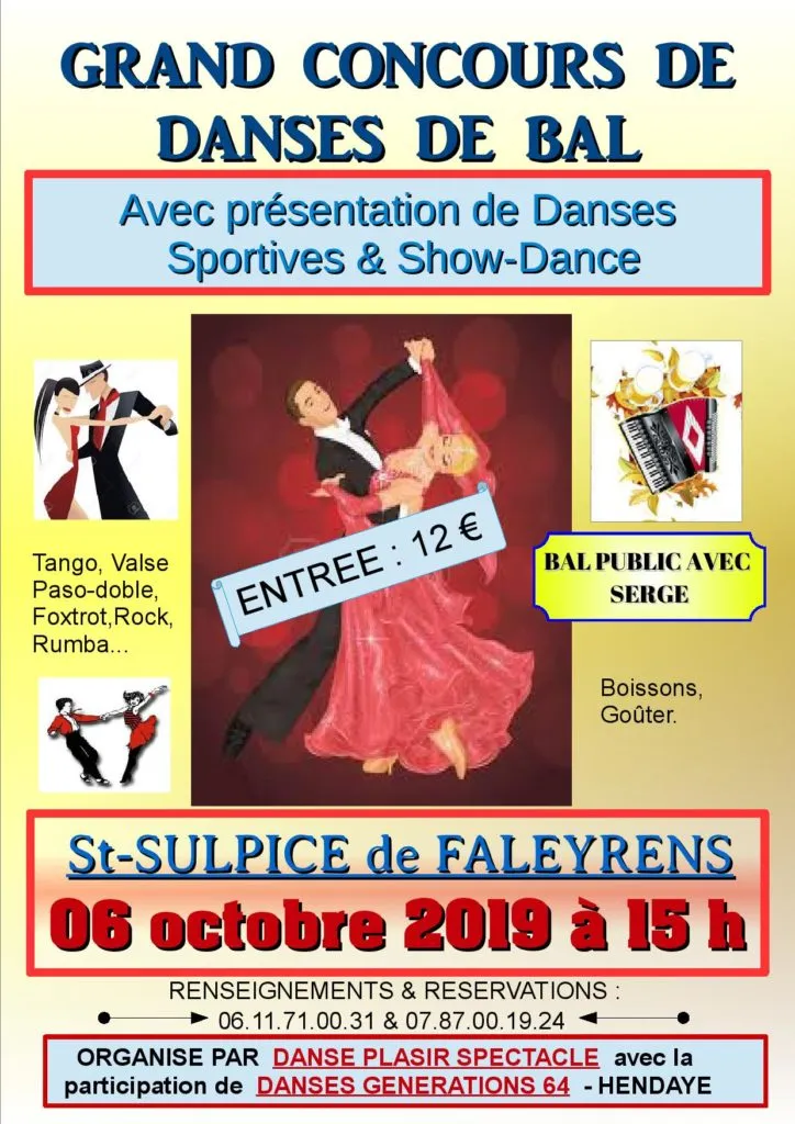 Dimanche 6 octobre à Saint Sulpice de Faleyrens, Grand concours de danses de bal avec démonstrations de danses sportives et show danses. Vous aimez la danse ? Rendez-vous au foyer communal, à 15h00, et profitez de démonstrations remarquables et d’un bal public. Entrée 12 €, boissons – goûter en vente sur place.