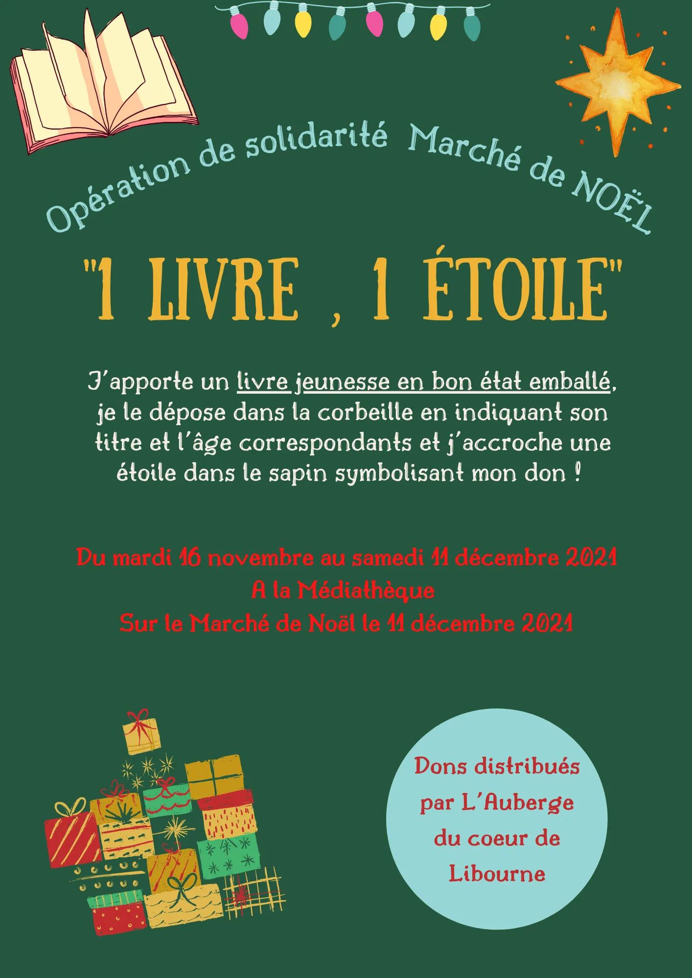 Pour fêter cet événement, qui n’a pu avoir lieu l’année dernière, la médiathèque s’associe au Marché de Noël de la commune le 11 décembre prochain, en proposant une opération de solidarité intitulée « 1 livre, 1 étoile », dont les dons seront distribués aux enfants par L’Auberge du cœur de Libourne.