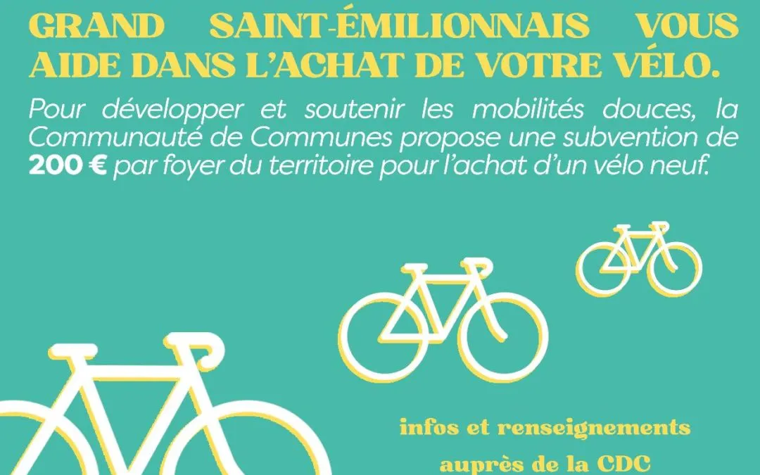 La Communauté de communes du Grand Saint-Emilionnais met en place une prime aux vélos pour les habitants des 22 communes. Il s’agît d’une aide financière de 200€ par foyer pour l’achat d’un vélo neuf classique (musculaire) ou à assistance électrique d’un montant supérieur ou égal à 200€.