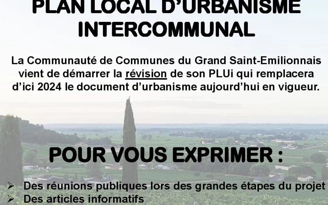 Par délibération du 01/07/2021, la Communauté de Communes du Grand Saint-Emilionnais a prescrit la révision de son Plan Local d’Urbanisme intercommunal (PLUi), qui remplacera dès 2024 le document d’urbanisme intercommunal aujourd’hui en vigueur.
