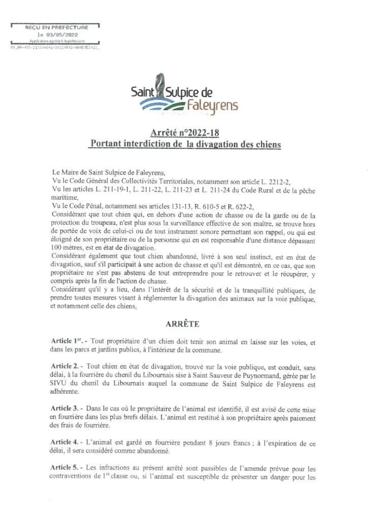 Cette disposition complète la délibération  du conseil municipal en date du 5 avril 2022 qui fixe à 22 € la contravention pour le ramassage d’un animal sur la voie publique et à 44 € le ramassage + transport de l’animal au SIVU chenil du Libournais.